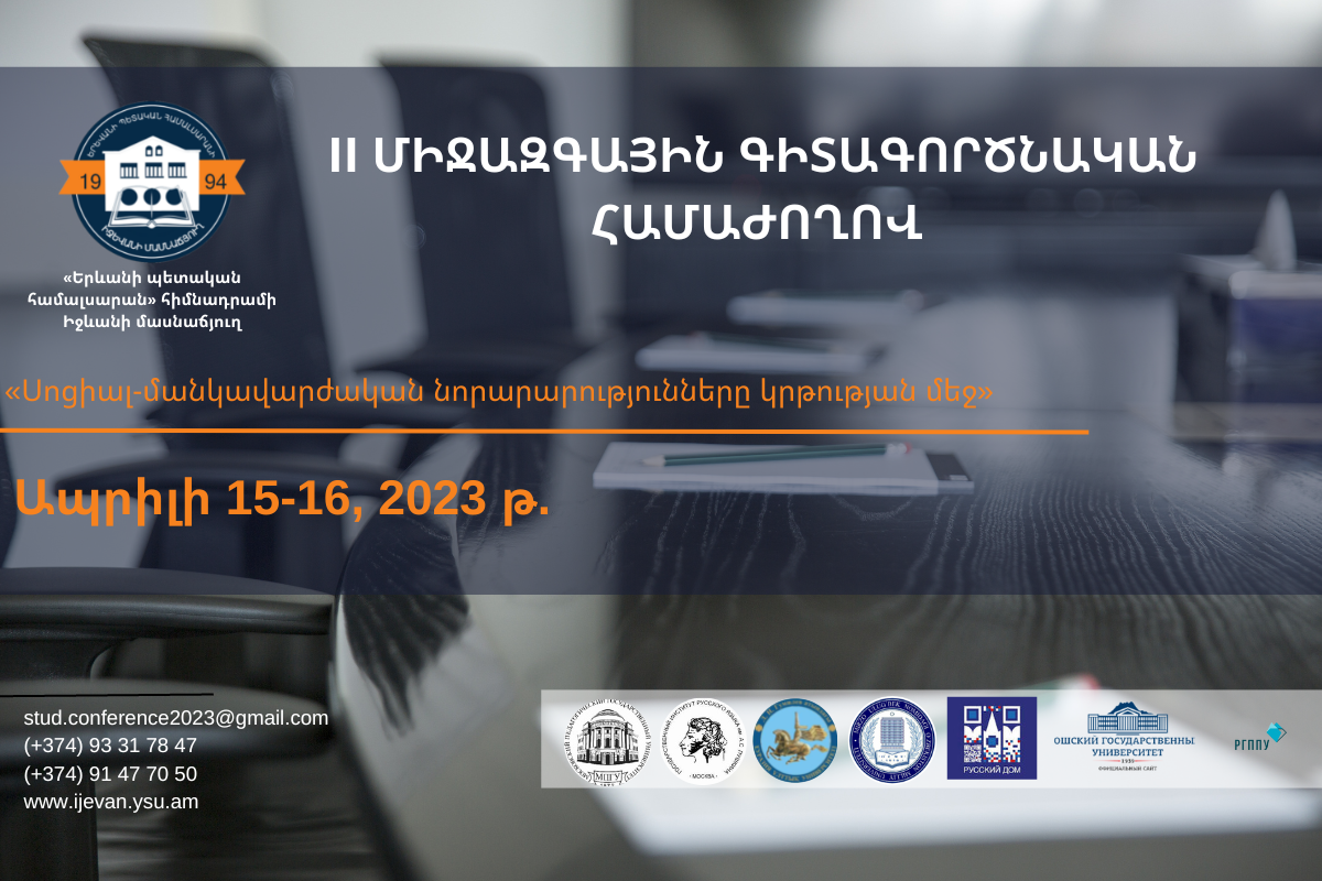 2023թ. ապրիլի 15-16-ին ԵՊՀ Իջևանի մասնաճյուղը կազմակերպում է «Սոցիալ-մանկավարժական նորարարությունները կրթության մեջ» երիտասարդ գիտնականների միջազգային գիտագործնական 2-րդ համաժողովը, որին կարող են մասնակցել բակալավրիատի և մագիստրատուրայի տարբեր մասնագիտությունների ուսանողներ, երիտասարդ դասախոսներ և գիտնականներ: